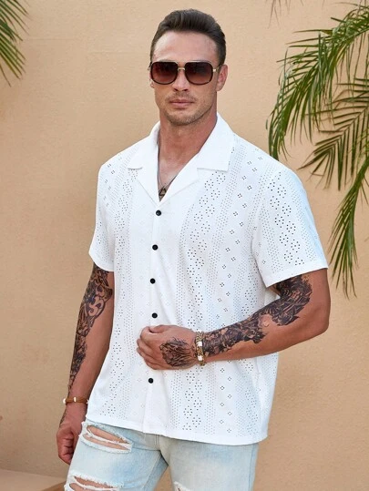 Manfinity Homme Men Eyelet Embroidery Button Up Lapel Neck Shirt