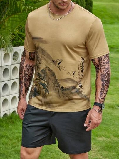 Manfinity Homme Men Mountain & Letter Graphic Tee Without Necklace
