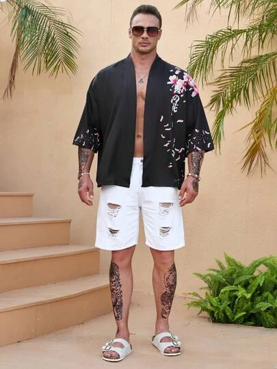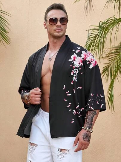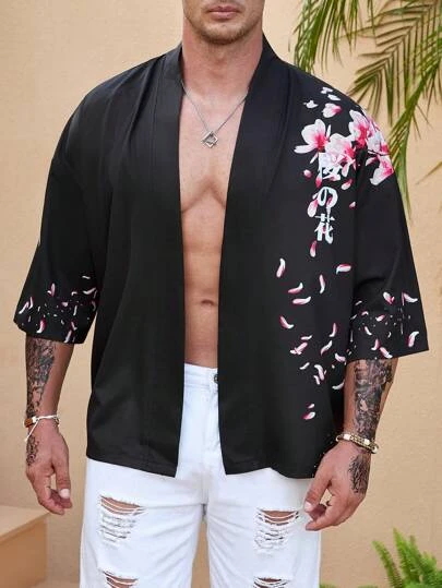 Manfinity RSRT Men Plus Floral & Japanese Letter Graphic Drop Shoulder Shirt