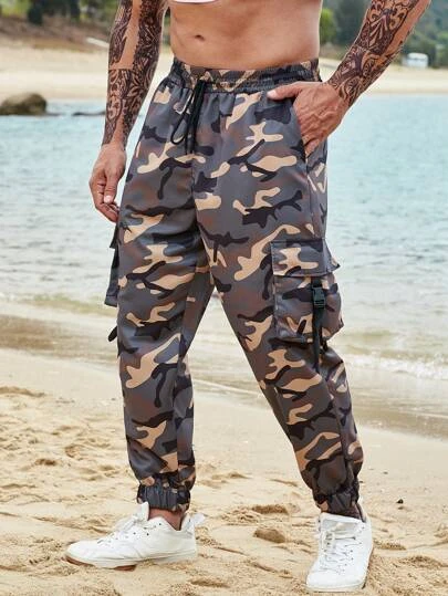 Men Camo Print Flap Pocket Drawstring Waist Cargo Pants