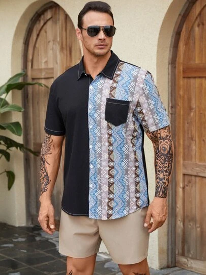 Men Geo Print Patched Pocket Shirt