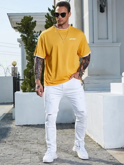 Men Letter Graphic Contrast Trim Drop Shoulder 2 In 1 Tee
