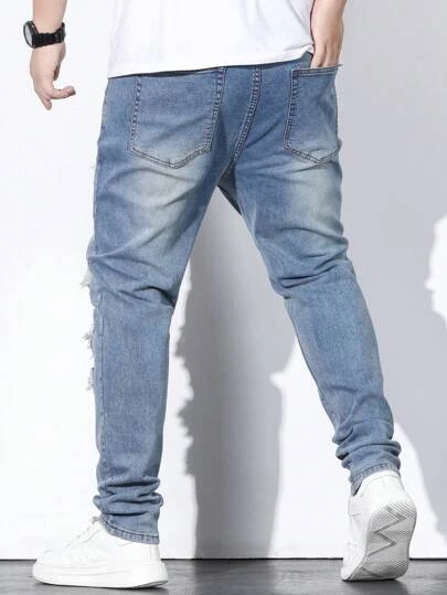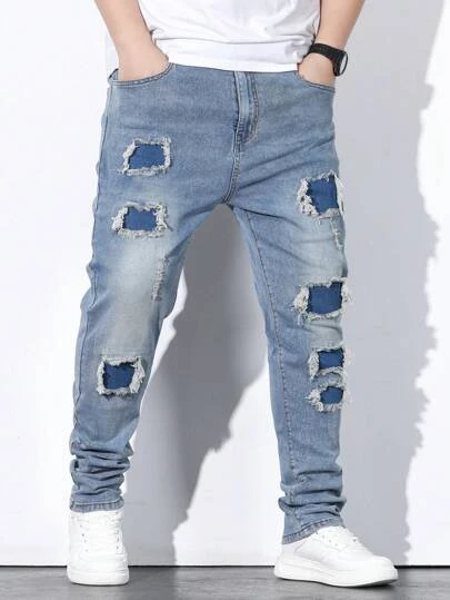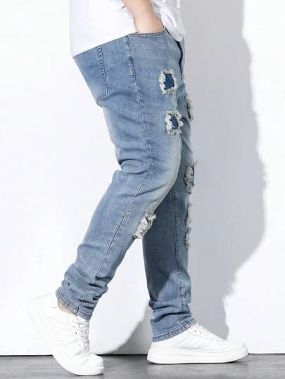 Men Plus Ripped Frayed Rag Stitching Skinny Jeans