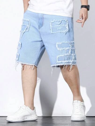 Men Plus Ripped Frayed Raw Trim Denim Shorts