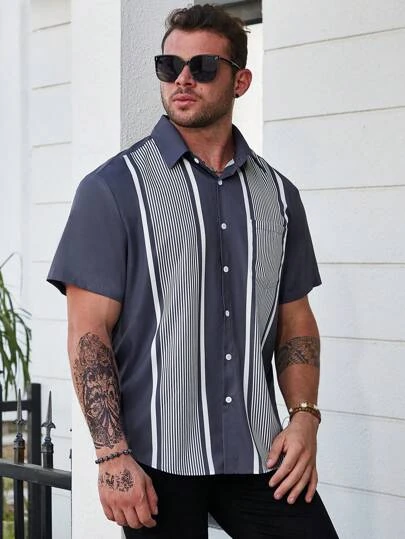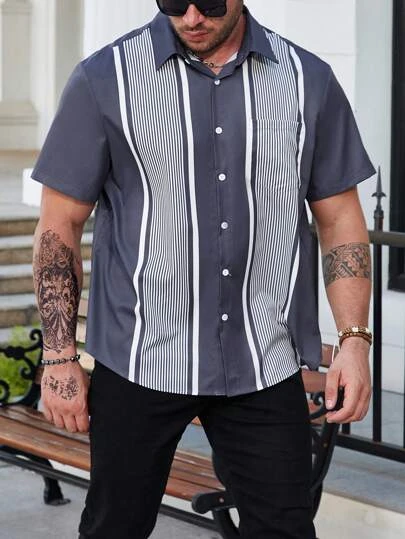 SHEIN Manfinity Homme Men Plus Striped Print Pocket Patched Shirt