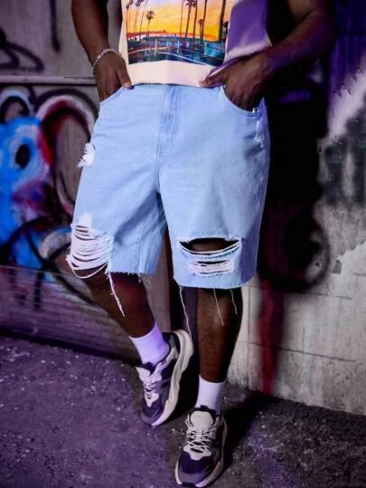 SHEIN Men Cotton Ripped Frayed Raw Hem Denim Shorts