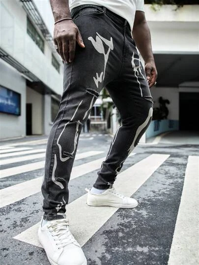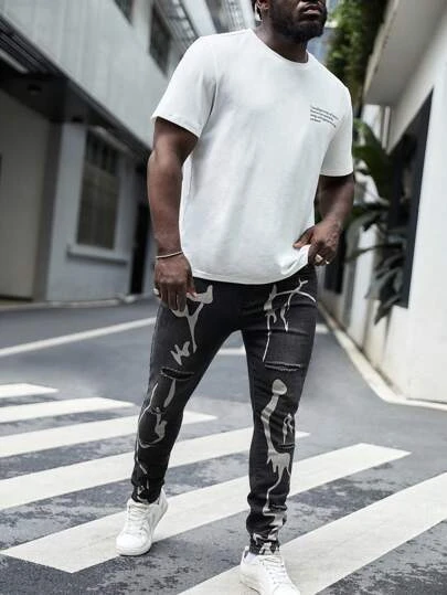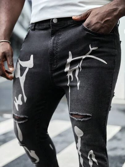 SHEIN Men Plus Cotton Graphic Print Ripped Skinny Jeans